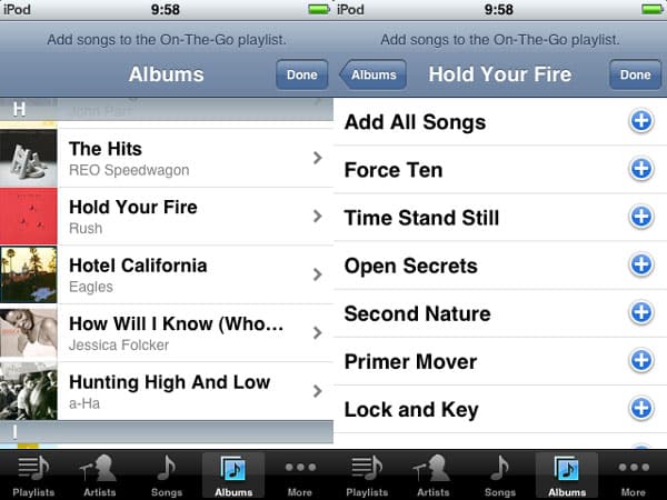For more precise control, you can place your albums in a playlist, either by building the playlist in iTunes itself and then transferring it to your iPod touch, or by using the On-The-Go playlist to build a playlist on your device – you can easily add entire albums to the On-The-Go playlist by browsing into each album and choosing the “Add All Songs” option.