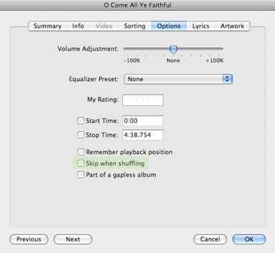 This latter option can be found by selecting a track in iTunes, and choosing File, Get Info. The track properties should appear, and on the “Options” tab, simply UNcheck the box marked “Skip when Shuffling” and save the track.