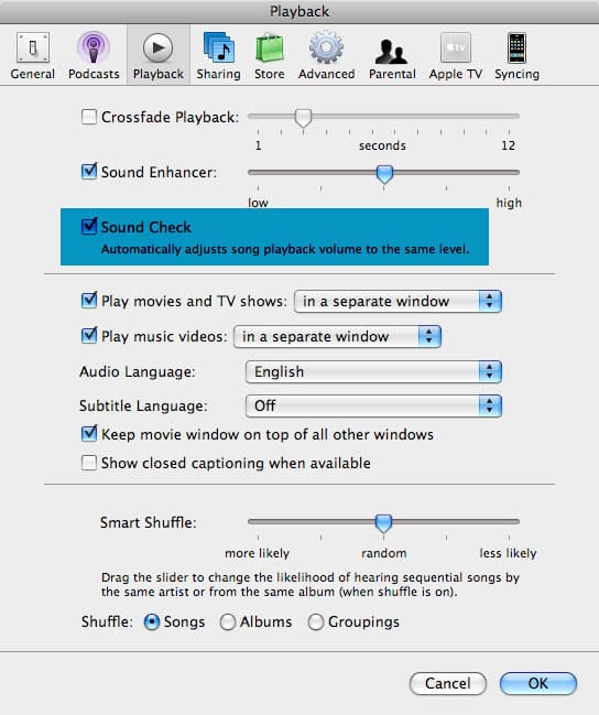 To enable Sound Check in iTunes, simply go into your iTunes preferences and select the “Playback” tab: