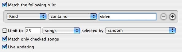 Here’s how we’d solve the problem. Instead of using “Automatically update all videos,” we’ll use “Automatically update selected playlists only.” For this, we’ll need to create a smart playlist that returns only checked videos: