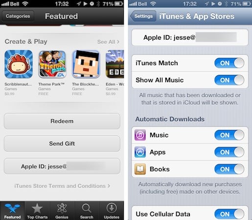 Alternatively, you can simply log into your old iTunes Store account from your new iPhone and re-download the apps directly from the Purchased section in the App Store app on your device. You can sign out of your current App Store account and sign in with a new one either by scrolling to the bottom of the main page in the App Store app, or choosing iTunes & App Stores in the iOS Settings app.
