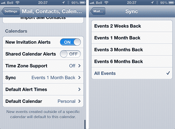 A: By default, the iOS Calendars app only synchronizes and retains the last months’ worth of events on your device, regardless of how much data is stored in whatever cloud or desktop calendar application you’re synchronizing with.