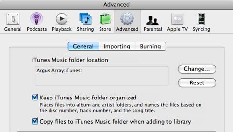To do this, simply go into iTunes advanced preferences by selecting Edit, Preferences from the iTunes menu, and then selecting the Advanced tab: