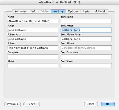 Within the sorting tab, you can override the sort order for any of the key sorting fields. To do this, simply enter the text based on how you would prefer that the track be sorted, as shown in the example above (ie, “Coltrane, John”). iTunes will sort that particular track according to how the text is entered in these sort fields.