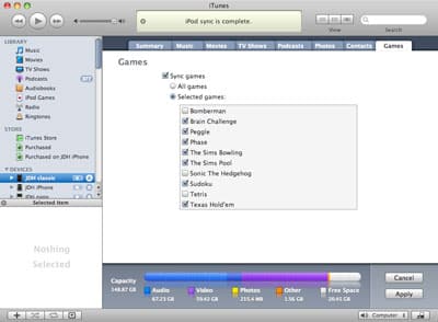 Either select to synchronize all games, or choose selected games and place a checkmark beside the game you wish to transfer. Click the “Apply” button, and iTunes will sync the game to your iPod.