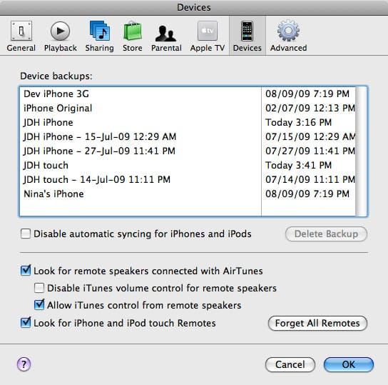 Note that this information is not stored directly under the iTunes folder, but in a separate location on your hard drive under your home profile folder in the Application Data\Apple Computer\MobileSync\Backup folder. You can see the backups that iTunes has stored for any iPhone and iPod touch devices by going into your iTunes Preferences and selecting the “Devices” tab: