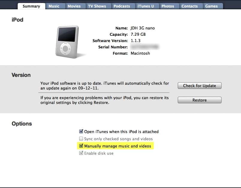 Music from other sources contained on the iPod should be playable without any problems, although it is recommended that you set the iPod to “manual mode” before sending it to him by checking the Manually manage music and videos option on the “Summary” tab in iTunes.