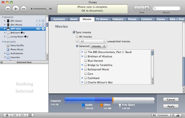To do this, connect your iPod to your computer, and then select it from the Devices list on the left-hand side of the iTunes window. You should see an iPod Summary screen in the main window, and a series of tabs at the top. Select the “Movies’ tab and you will see the settings for which movies are being synchronized to your iPod: