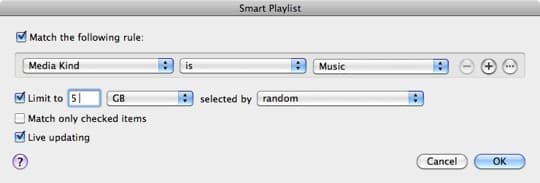 If your music is already 128kbps AAC, or you want to use higher bit-rate music on your iPad, then you will need to use the option to sync selected playlists and create a playlist of your music. For selecting random tracks, a Smart Playlist is the best option. Simply create a playlist that selects a certain amount of music, say 5GB, based on Random selection: