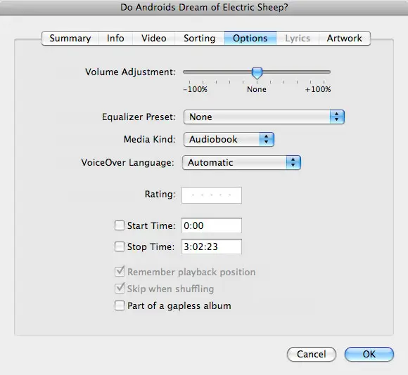 Q: When I buy an audiobook on CD and want to import it into my iTunes library, adding the description of “Genre: Book” does not make it become an audiobook. It seems that only the audiobooks you buy on iTunes can benefit from the speech acceleration mode of the audiobooks. Is there anyway around this?