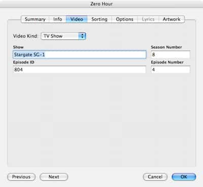 From this tab, you can change the category to “TV Show” and fill in information on the Show/series name (ie, “Family Guy”), as well as season number, and episode ID and episode number information. iTunes will then re-categorize the videos as TV Shows, and they will show up in the appropriate location in iTunes and on the iPod.