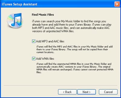 You can let iTunes do this for you, or you can skip this step and add these files manually later. If you let iTunes scan your hard drive for MP3/AAC/WMA files, you may end up with a lot more than you anticipated. Many games and other applications will have soundtracks and effects tracks stored in the MP3 format within their program folders, and iTunes may end up adding these to your library along with your normal music files.