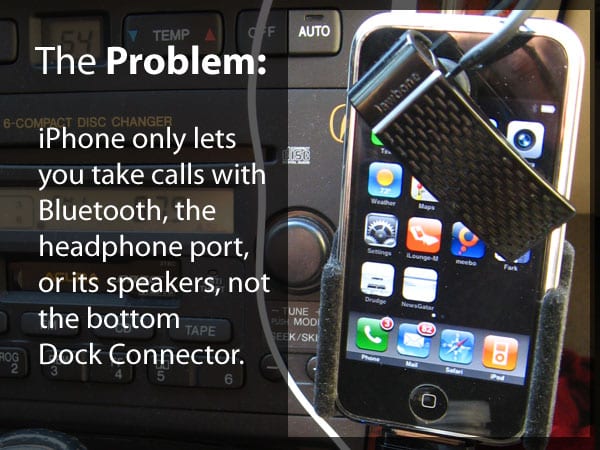 Next, there’s the Car Charger, which is sold with or without an integrated FM Transmitter. This part is necessary to keep your iPhone’s battery juiced up on the road, and enable you to hear its audio through most car stereos. The FM transmitter broadcasts whatever music is playing on the iPhone onto a radio station of your choice, but again, it doesn’t do anything with phone call audio.