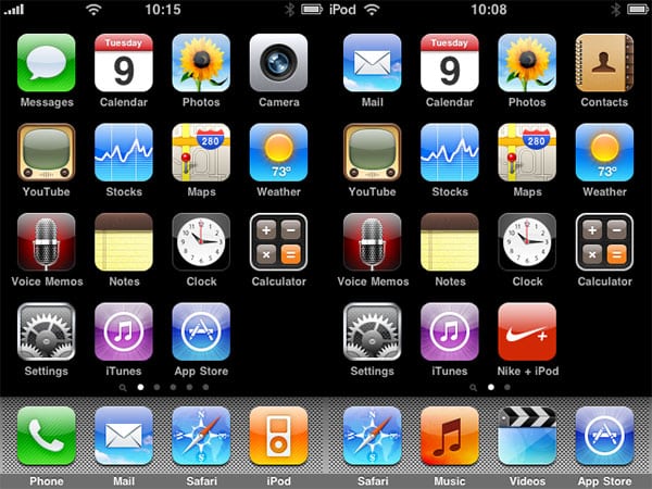 While many users expected that Apple would introduce a radical new approach to organizing or grouping applications, the company did not do so in the initial beta release of iPhone OS 3.0. Instead, the Home Screen received only minor changes: the Text app was renamed to “Messages” and given a new icon, the Stocks icon was updated, with sharper peaks and no calendar months at the bottom of the icon, and a tiny magnifying glass icon was added to the left of the white and gray page number indicator dots above the dock. The iPod and Phone icons also received diagonal line tweaks to make them look more like the new Messages icon.