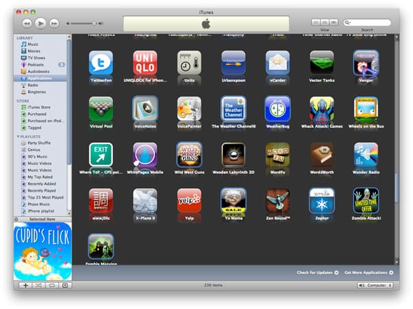 Method #2: Purge files directly from the iTunes Applications list. While you’re running iTunes, you can select multiple application icons at the same time, drag and drop to copy the applications into a folder on your computer, and then—without deselecting the applications that have been copied—right-click on an icon to delete them. This method is probably the least problematic in every way except speed: you get to see not just the name of the app you’re deleting, but also the icon, which may help users with large app libraries jog their memories. That Amaze.ipa app you saw in the Mobile Applications folder? Oh, that’s aMaze!, a 3-D labyrinth game. Which Blackjack game is that one? Ah, Blackjack 21, the one I want to keep.