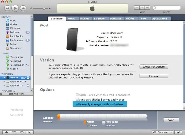 To enable manual mode, simply connect your iPod touch to your computer and select it from the iTunes Devices list on the left-hand side of the iTunes window. On the main “Summary” screen which appears, simply click the box labelled “Manually manage my music and videos” and click the “Apply” button to enable manual mode.