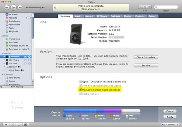 To check this, connect your iPod to your computer and then select it from the iTunes Devices listing at the left-hand side of your iTunes window. On the main “Summary” screen which appears, ensure that the box for “Manually manage music and videos” is checked: