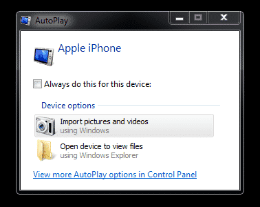 Windows includes a built-in photo import utility that should come up automatically when you first connect your iPhone to your computer, providing you with a choice between importing your pictures and videos automatically or opening Windows Explorer to browse the photo and video content on your device directly.