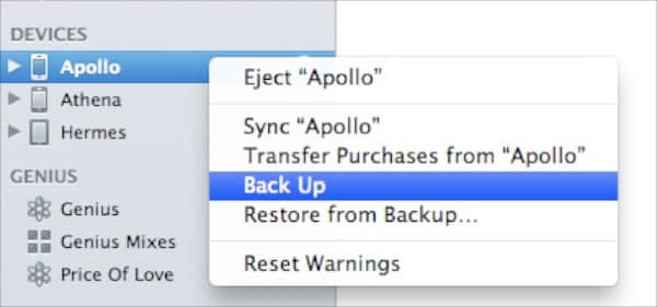 To back up your device to iTunes, plug it into your computer and then right-click on it in the Devices list on the left-hand side of your iTunes window. A context menu will appear with Back Up as one of the options. Simply click on this and iTunes will immediately make a backup of your device.