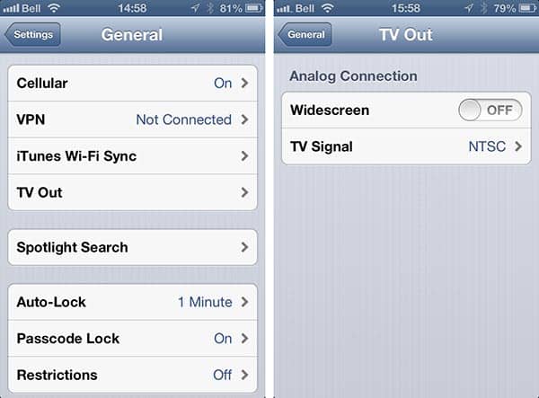 A: The TV Out option is actually still there in iOS 5, but it’s been both moved to a different section in the Settings app and hidden away unless you have connected a compatible video cable to your device.