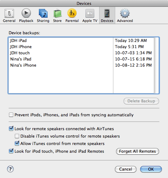 Note that if you’ve already set up your new iPod touch as a new device, you can still restore this old backup by right-clicking on it in the Devices listing in iTunes and choosing the Restore from Backup option. iTunes maintains separate backups for each device, so your new fourth-generation iPod touch will not overwrite the backup from your original second-generation device.