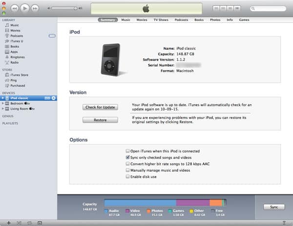 You can manage the existing content directly on the device and load on new content manually via iTunes simply by setting the device into “manual mode.” To do this, simply connect the iPod classic to your computer, start iTunes, and then select it in the Devices list on the left-hand side of the iTunes window. Look for the option labelled “Manually manage music and videos” and enable it. If you get a dialog box when starting iTunes that asks you to “Erase and Sync” your iPod, simply choose the “Cancel” option to bypass this.
