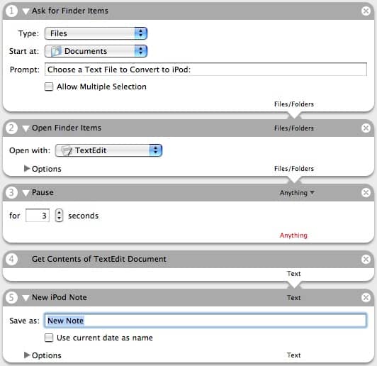 This will ask for a plain-text document, create a set of note files for your iPod (complete with “Previous” and “Next” page links!), and install them to a currently-connected iPod.