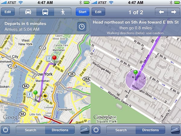 Maps now lets users in major metropolitan cities—including ones outside the United States—instantly access mass transit schedules, as well as getting customized directions from their current location to another destination either by foot, subway, or car. It also offers instant access to Google’s Street View images of actual locations wherever Google has taken them. Though both of these features have their limitations, and “Walking Directions” is described in Maps as a “Beta” feature, they’re a strong start, and the number of cities covered by Street View is already impressive.