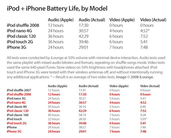 The full results of our tests can be seen in the iPod nano review, iPod touch review, iPhone 3G review, and soon-to-be-released iPod classic review.