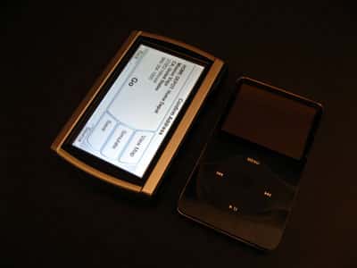 As noted in this brief prior Backstage article, we were originally going to pass on covering Guide + Play because it’s not iPod-specific. In fact, it’s sort of an iPod alternative. Measuring 4.5” by 2.875” by 0.75”, it packs a comparatively huge screen, advanced GPS software, and the ability to play back MPEG-4 videos or MP3 music files on the go. You can even listen to music through its integrated speaker while it’s acting as a GPS system for your car. And man, is the GPS performance a knockout. Menu graphics aside, it’s as good as an Apple design from a GPS interface standpoint, and that’s really saying something.