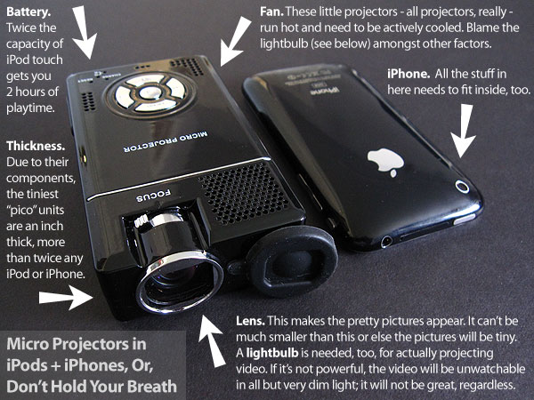 Sure, Apple could build a miniature video projector into iPods and iPhones, as per the rumors du jour. But the chances of this happening any time soon are really, truly low.