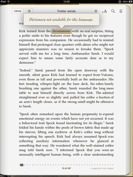 Unfortunately, after updating to iBooks 1.1 I discovered that I could no longer use the dictionary for any of my own converted titles. Tapping on a word and asking for a dictionary lookup, which worked fine in the prior version of iBooks, now resulted in a pop-up window with the message: “Dictionary not available for this language.”