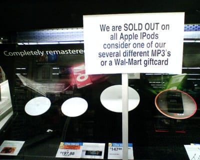 Sure, it’s nothing conclusive, but how interesting is it that local Wal-mart stores are completely sold out of all iPod models except the shuffle? (We wouldn’t have guessed they’d be out of the full-sized iPods but still have shuffles to go around.)