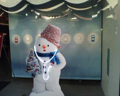 Yes, there are some interesting things happening inside Apple Stores too. By now, you’ve surely seen their holiday-themed exteriors – snowmen with glowing white iPod earphones and nanos, flanked by graphics of the new aluminum shuffles and colored nanos – and the really cool Mac and iPod promotional videos that are playing on the demonstration computers. That’s all old stuff, if November news can be considered old.
