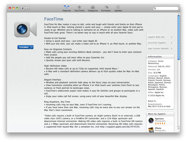 A day after leaks revealed that Apple was planning to rebrand Mac iSight cameras as “FaceTime” and “FaceTime HD” cameras—the former at the 640×480 resolution of iPhone 4, iPod touch 4G and earlier Mac iSight cameras, the latter at a then-unknown but likely higher resolution—it’s official: FaceTime 1.0 has arrived for the Mac at a $1 asking price, available through the Mac App Store. (The free beta version of FaceTime continues to work, too, if you’ve already downloaded it.)
