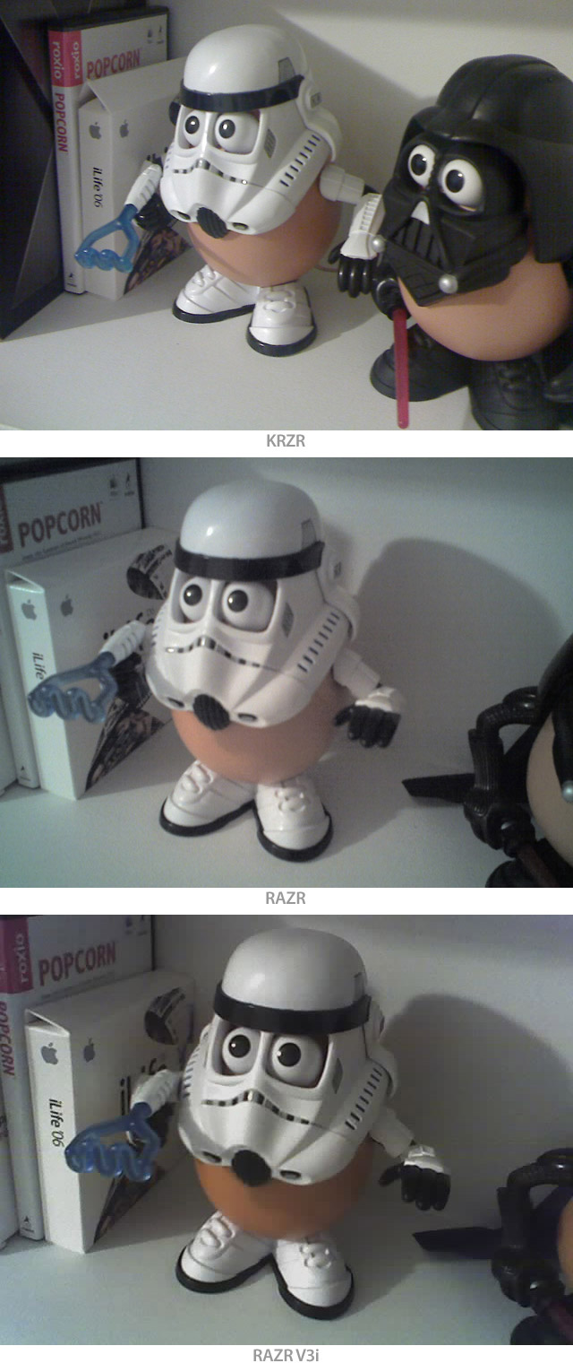 – The 2-megapixel camera is better than the RAZR and RAZR V3i, though not as great as I had hoped. A sample of the KRZR’s photo quality, compared to the RAZR and RAZR V3i, can be seen here. Note that all of the photos were scaled down from their original sizes to 640×480 (the KRZR’s pics are 1600×1200 at full size).