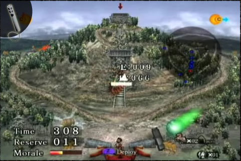 As it turns out, the progress of your bell is aided by reserves of soldiers you call up by the dozens from the bottom of the screen. Using the microphone, you can bark at them to “rally” to items scattered on the fields, “press forward,” turn left or right, and more; on some missions, you can order them to close a dam to allow the bell to pass through watery rapids, or fetch keys to open up alternate pathways for the bell to travel to the top of the screen. The key to success is juggling the demands of controlling your armies and paddling around the Odama ball; it’s impossible to win without developing some skill at doing both.
