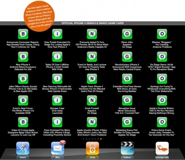 Apple’s going to be holding a press conference tomorrow to address complaints about the iPhone 4—or so everyone thinks! Since no one’s really sure who’s going to be speaking and what’s going to be said, we’ve come up with this little Bingo card with a mix of likely possibilities and wildcards.