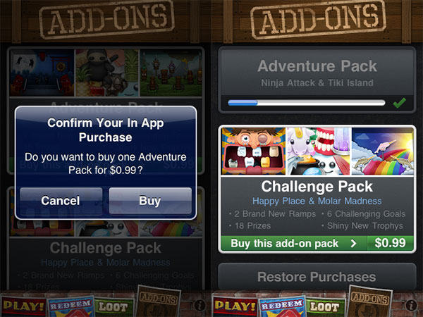 What was especially noteworthy about Ramp Champ was an iPhone 3.0-specific feature that we’ve already seen demonstrated poorly and used poorly, but not really used well: In-App Purchasing. There are fears, frankly with very good foundation, that developers will transform their iPhone OS titles into miniature ATM machines, selling games with very limited functionality and then charging players for every stage or two, bundles of weapons, music, and other features that the typical game just includes without a whole bunch of “Buy Now” buttons.