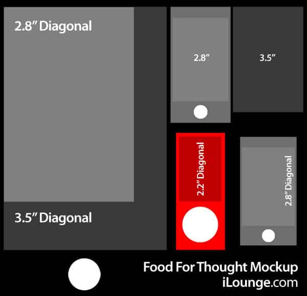 So a 2.8” screened miniature iPod touch with 480×320 resolution wouldn’t be a huge leap of faith at this point, and the fact that there are still little chirps here and there about 2.8” and 3” screened iPods has had us curious. We did a little measuring to compare a hypothetical design against the fifth-generation iPod nano and came up with the image you see here, using plausible assumptions, showing a couple of interesting things. First, the device would be a bit wider than the current nano because of the screen, but not much taller, even if the Home button was around the same size as the ones on full-sized iPod touches and had around the same space to breathe. The loss of screen space would be noticeable but not terrible, leading more to a question of whether Apple would just shrink the existing iOS home screen or crop it with fewer icons—the squinty size of Home screen text would seem to suggest the latter, though games and other apps could be updated on an individual basis with larger buttons where necessary. It would work—at least as well as with the iPad, only in the opposite direction. You can debate whether Click Wheel or touch is the right interface for a device like the nano, what the correct physical size is for a device that fits the nano’s target markets (athletes/kids/etc), and so on, but that’s roughly what a 2.8” touch device would look like dimensionally. Shave down the screen and the rest of the device can obviously get smaller.