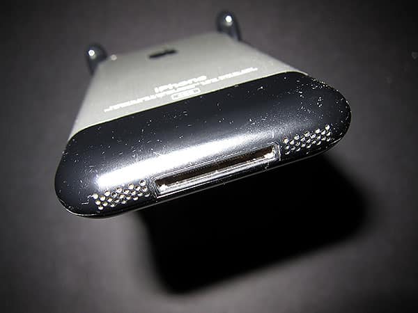 So we tried to fix the iPhone. The simplest “3 R’s” troubleshooting techniques suggested by Apple didn’t work: “Restart,” “Reset,” and “Restore,” respectively just turning the device off and on, clearing its settings, and then wiping its content altogether with iTunes. Restore seemed to have the greatest impact, but the nag screen quickly returned. There was clearly a hardware problem of some sort, and the most obvious culprits were a screwy Sleep/Wake switch or a dirty Dock Connector. If you haven’t seen what a typically pocketed iPhone’s bottom looks like after three years, these pictures tell most of the story—believe it or not, this is what the iPhone’s black plastic bottom panel looked like after it was cleaned.