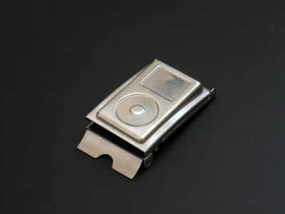 Last week, Core dropped off final samples of two different belt buckles – large and small sizes, each depicting the fourth-generation iPod. (The larger-screened 5G was introduced a week after we saw the first prototype, and we suspect that the changes weren’t significant enough in Core’s view to merit a redesign of the buckle.) Rather than using the earlier all-metal design, these new buckles (below) feature hard plastic white and gray iPods against a metal belt surface. They’re still not up on the company’s web site for sale.