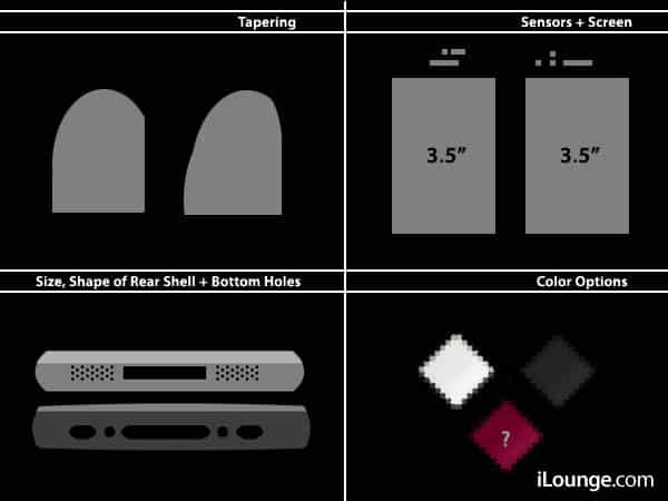 While the screen size stays the same in this model—3.5” diagonal, with 3” height and 2” width, some currently unexplained changes are made around the ear speaker. On iPhone, a proximity sensor and ambient light sensor sat above this speaker; the new version has what appear to be three separate sensors, or two sensors and a tiny second camera—the original camera stays where it was. Though it would be great to picture this new dot as a video iChat-ready camera location, it’s entirely possible that this is nothing more than a rearrangement of the proximity sensor array. And colors? Glossy black or white backs are apparently locks, with a red version possible, too. Each would have the same silver bezel on front, and substantially black material surrounding the screen.