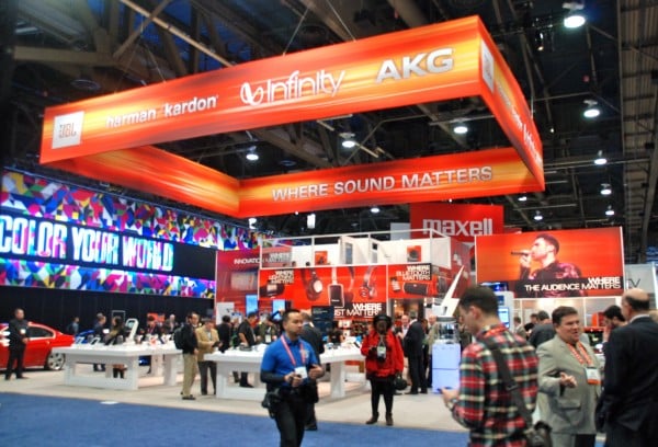 The JBL and Harman/Kardon booth featured displays of speakers, headphones, car audio, and other accessories.