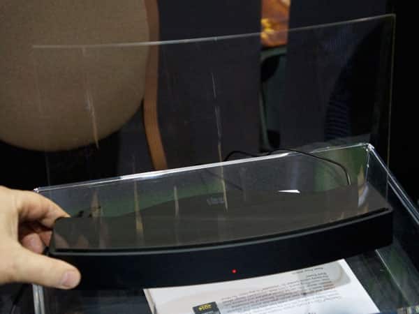 Standing out from the numerous “black box” speakers on the market and the CES show floor, ClearView Audio debuted its Clio ($349). The Bluetooth stereo speaker utilizes a unique design, with a short base and a much taller thin, curved, acrylic glass transducer.