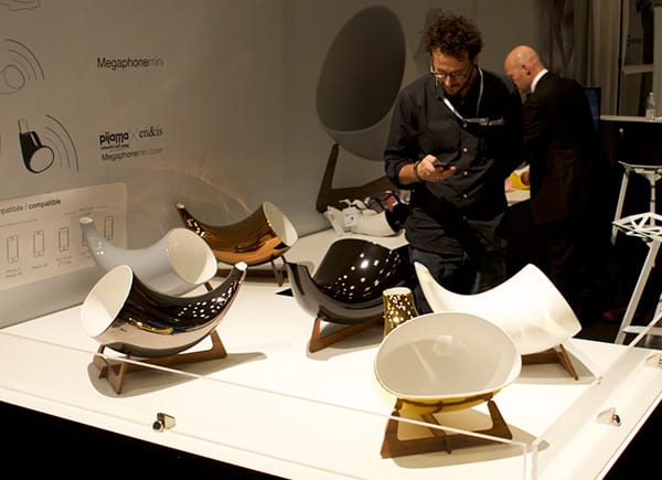Shaped like giant horns, En & Is’s Megaphone ($399-$599) and Megaphonemini ($199) are passive sound amplifiers designed to hold an iPhone on top and radically enhance its speaker’s amplitude.