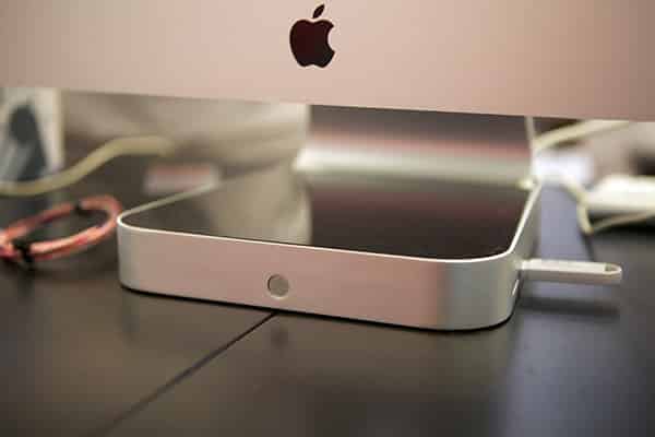 CableCore Hub’s boxy foot-of-iMac design is meant to eliminate the need to connect devices to the back of the iMac. Three USB 3 ports — complete with high-speed charging for each port — link into a single USB port on the iMac, with extra power from a wall adapter.