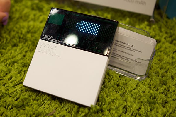 Virtue (price TBD) combines a 9000mAh battery pack with an LED clock, and the ability to use the clock face to provide a battery graphic indicating remaining power. One portion of the boxy battery is translucent.