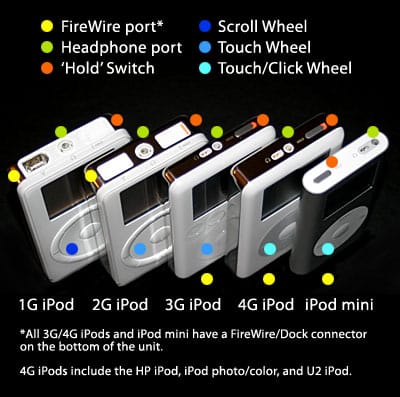 The G4 (4rd generation, docking) iPods, also known as docking iPods, introduced a new Click Wheel similar to the iPod mini and is uses the same form factor as the G3 iPod. The body houses a smaller battery than G1/G2 iPods and is rated for up to 15 hours of charge, the most battery life out of any previous iPod models.