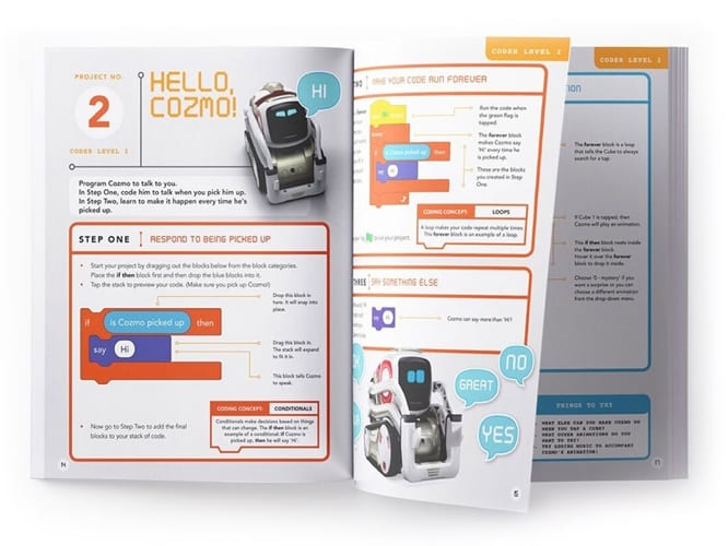 “Create with Cozmo” is a 95-page book that introduces basic coding concepts to let users customize their own games and projects, greatly expanding the Cozmo experience. It’s broken down into three levels to allow kids to move at their own pace through it, beginning with eight cool projects that cover the basics of coding, and working up to complex projects with advanced computational concepts.